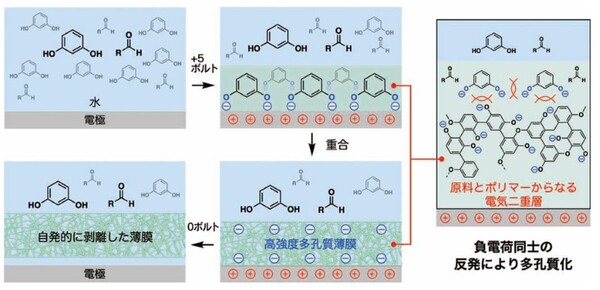 市販の安価な試薬であるレゾルシノール(C₆H₆O₂)とホルムアルデヒドの水溶液に電極を入れ、5ボルトの電圧をかけると、正極の表面全体を均一に覆う形で重合反応が進行。厚さ70ナノメートル(ナノは10億分の1)の薄膜が無欠陥で生成されます。反応が進む際には、溶液中のモノマーとポリマーが共に負に帯電し、正極上に集積します。モノマーやポリマーは電荷によって互いに反発し合うため、隙間が生まれて多孔質化する仕組みです。