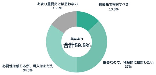 - 一方で、34.5%は「必要性は感じるが、導入はまだ先」と回答しており、重要性を認識しつつも、具体的なアクションには至っていない企業も一定数存在。