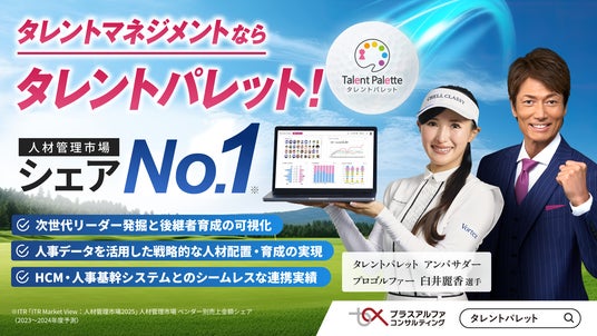 株式会社プラスアルファ・コンサルティング(本社:東京都港区、代表取締役社長:三室克哉 証券コード:4071)が提供する、データに基づく人材活用や人的資本経営の実践、人事業務のDX化、リスキリングの推進などを目的に、多くの企業で導入が進むシェアNO.1(*)タレントマネジメントシステム「Talent Palette(以下:タレントパレット)」は、“大きな組織” の社長を演じるマイケル富岡さんとプロゴルファーの臼井麗香選手とのコミカルなやり取りを描いたCMを放映開始します。