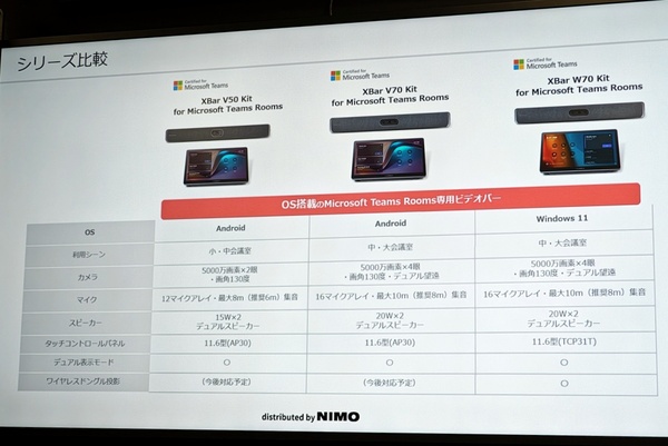 従来のMTRシリーズは、4K大型タッチパネルに、カメラ、マイク、スピーカーを搭載した「MTR Board」がラインナップされていたが、今回はビデオバー「XBar」に3機種が追加される。発表されたのは、Android OS搭載の「XBar V50 Kit For Microsoft Teams Rooms」と「XBar V70 Kit For Microsoft Teams Rooms」、世界初を謳うWindows OS搭載の「XBar W70 Kit For Microsoft Teams Rooms」の3機種となる。希望小売価格はオープン。
