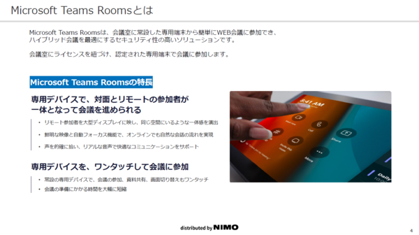 本体と11.6型のタッチパネルコントロールのセットがセットで提供され、ディスプレイに接続するだけでMicrosoft Teams Roomsを利用できる。個人のPCやスマホで会議に参加するMicrosoft Teamsに対し、Microsoft Teams Roomsは会議室単位にライセンスを付与し、Microsoft Teams Rooms認定デバイスで会議に参加する。会議室に入れば自動的に電源がつき、デバイスのパネルにタッチするだけで会議が開始できる。