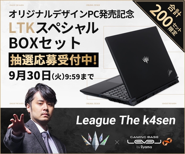ユニットコムは9月29日、iiyama PCのゲーミングPCブランド「LEVEL∞(レベル インフィニティ)」から、新モデル「League The k4sen オフィシャル オリジナルデザイン ゲーミングノートPC」の発売を記念し、限定200セットの「LTKスペシャルBOXセット」抽選販売の応募受付を開始した。応募締め切りは9月30日9:59までとなっている。