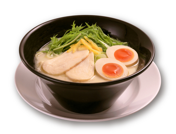 鶏白湯らーめんは、鶏の旨みとコクがありながらも、サラッと軽やかな口当たりに仕上げた一品。具材として蒸し鶏、味玉、水菜がトッピングされています。
