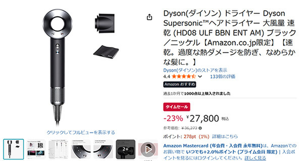 Dyson(ダイソン)から、過度な熱から髪を守りつつ、素早く乾かすドライヤー「Dyson Supersonic」がAmazonタイムセールに登場。