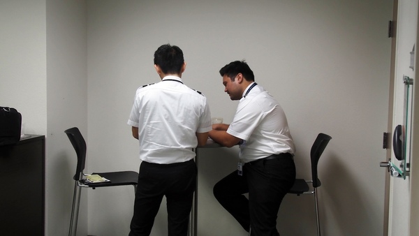 教官とブリーフィングしたのち、最終確認の場となるディスパッチルームでフライトプランなどを確定。そのあとは実機の点検をしたあと、飛行機に乗り込んで実際のフライト訓練を開始します。このようにアクロンの訓練施設では、実際に旅客機を運航する動きを同時に学べるわけです。