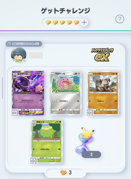 通常は1パックあたり5枚のカードが封入されているものの、レア確定なのは嬉しいポイント。ただ、実装前から「ゲッチャレ(ゲットチャレンジ)はどうなる?」という疑問があった。その答えは……1枠分を「パック砂時計」にするというものだった。