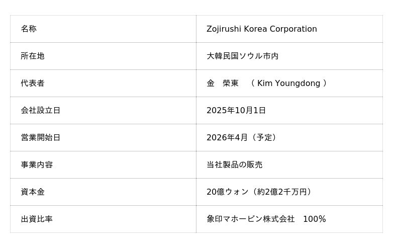 象印マホービン株式会社は、2025年10月1日付で大韓民国(以下、「韓国」)に当社が100%出資する販売子会社を設立することといたしましたので、下記の通りお知らせいたします。