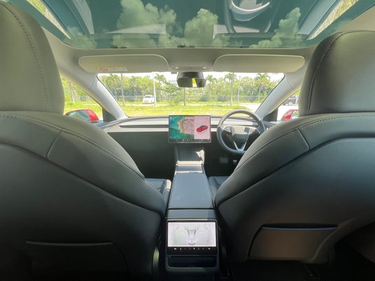 テスラ モデル3の車内。タッチスクリーンにボタンが集約されたシンプルな設計、沖縄の青空を感じられるガラスルーフ、リアシートのタッチスクリーンでは走行中にYouTube等の視聴も可能