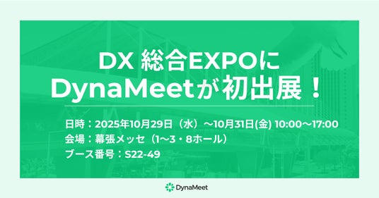 DynaMeet株式会社(本社:東京都渋谷区、共同創業者CEO兼CTO:Ayan Ray、以下 「当社」)は、2025年10月29日(水)から31日(金)に幕張メッセで開催される「DX 総合EXPO」に出展いたします。AI営業自動化ツール「Meeton ai(ミートン エーアイ)」のデモンストレーションを通じて、属人化しがちな商談創出をAIと人の共働で仕組み化する方法をご覧いただけます。