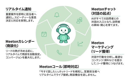 - Meetonチャット:すべての対話の起点となるAIチャット機能。訪問者の質問やニーズを的確に把握します。