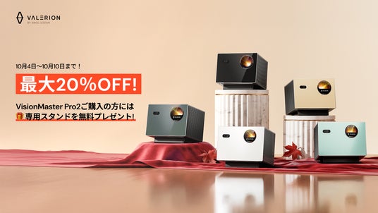 ホームシネマプロジェクターのリーディングスペシャリストValerionは、2025年10月4日(土)から2025年10月10日(金)まで、Amazonで開催されるAmazonプライム会員限定のビッグセール「Amazonプライム感謝祭」と先行セールの期間中、Valerion製品を最大20%OFFにて販売いたします。また、同期間中、独自のご購入者特典を2パターン実施し、Valerion VisionMaster Pro2をご購入いただいた方は、天井取付金具あるいは卓上ジンバルスタンドのいずれかを選択の上プレゼント、そして、Valerion VisionMaster Pro2あるいはProとスクリーンを同時ご購入いただいた方には、卓上ジンバルスタンド1つと3Dメガネを3つプレゼントし、最大264600円の割引を実施いたします。