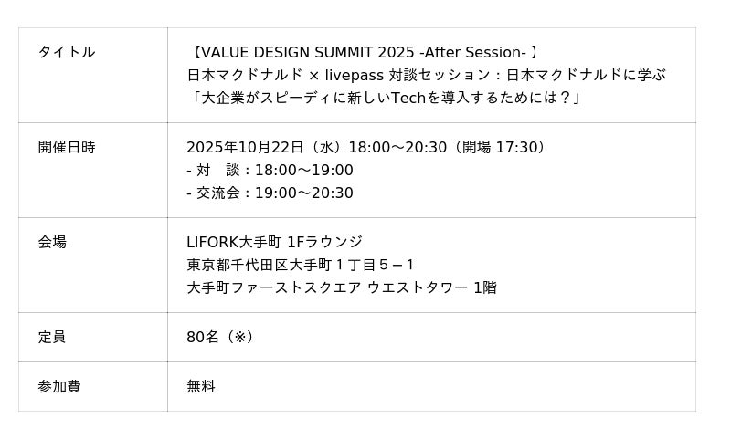 本セッションでは、ゲストにVALUE DESIGN SUMMIT本編に登壇された日本マクドナルドCTOの杉林様、livepass CEOの中村様をお招きし、「大企業がスピーディに新しいTechを導入するためには?」をテーマに議論いただきます。巨大企業でありながら、いかにしてスピーディなTech導入を実践しているのか、多くの企業が陥りがちな課題とその打開策を、具体的な事例を交えながら深掘りし、実践的な学びを提供します。
