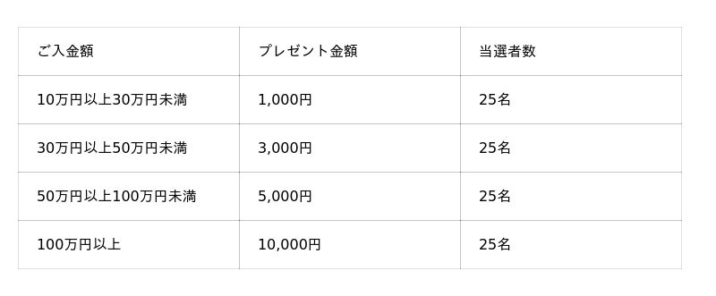 「入金キャンペーン」では、期間中の一括入金額に応じて、抽選で下記の金額をプレゼントします。