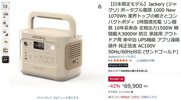 Jackery(ジャクリ)から、業界屈指のコンパクトさを誇るポータブル電源「1000 New 1070Wh」がAmazonタイムセールに登場。