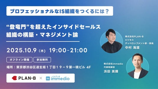 株式会社immedio(本社:東京都渋谷区、代表取締役:浜田 英揮)は、2025年10月9日(木)に株式会社PLAN-Bの中村氏を招聘し、BtoB事業の成長を加速させるインサイドセールス(IS)組織の構築とマネジメントをテーマにした無料オフラインセミナーを開催します。