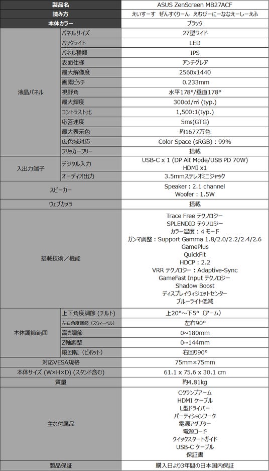 製品詳細:https://www.asus.com/jp/displays-desktops/monitors/zenscreen/zenscreen-mb27acf/