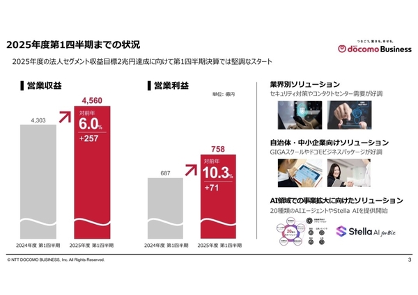 昨年度は、厳しい局面がつづく中堅中小企業セグメントのマイナスを、大企業セグメントでの成長によって補う事業状況だったという。一方で、「ここ1年、改めてマーケットを徹底的に見直してきた」と小島氏。その成果として、2025年度の第1四半期は、営業収益が前年同期比で257億円増(6%増)の4560億円、営業利益が71億円増(10.3%増)の758億円と、堅調なスタートを切った。中堅中小企業セグメントも4%のプラス成長に転じている。