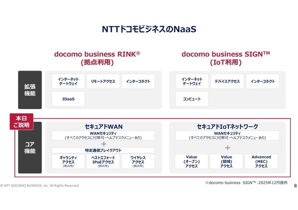 NTTドコモビジネスでは、NaaSとして主に、拠点間をつなぐ「docomo business RINK」とIoT向けの「docomo business SIGN」(2025年12月に提供開始)を用意する。(参考記事:IoT構築のハードルを下げる NTTドコビジが“セキュリティ標準搭載”の新NaaS)