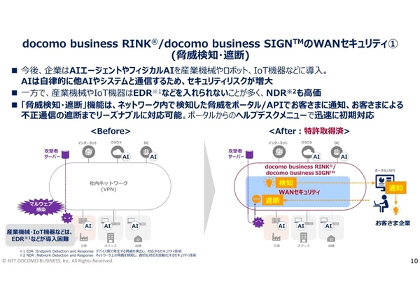 docomo business RINKは、AIによる自律的通信にも対応できるよう、ポータルやAPIから帯域の柔軟な変更が可能であり、分単位(月額上限付き)の従量課金となっている。さらに、docomo business RINKとSING共に、コア機能として、ネットワーク内で異常通信を検知し、ポータルからその通信を遮断可能な「WANセキュリティ」の機能を備えている。本機能で、セキュリティ機能を組込みにくい産業機器やIoT機器においても脅威リスクを抑えることができる。