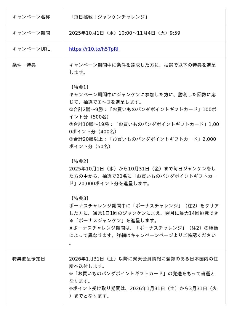本キャンペーンでは、キャンペーン期間中に「楽天ペイ」アプリもしくはキャンペーンページからジャンケンに参加した方に、勝利した回数に応じて、抽選で「お買いものパンダポイントギフトカード」最大2,000ポイント分を進呈します(注1)。また、毎日ジャンケンに参加した方の中から抽選で20名に「お買いものパンダポイントギフトカード」20,000ポイント分を進呈します(注1)。さらに、「ボーナスチャレンジ」(注2)をクリアした方には、通常1日1回のジャンケンに加え、翌月に最大14回挑戦できる「ボーナスジャンケン」を進呈します。「ボーナスチャレンジ」(注2)は、5つの条件から構成され、「楽天モバイル」契約者限定の特典もあります。