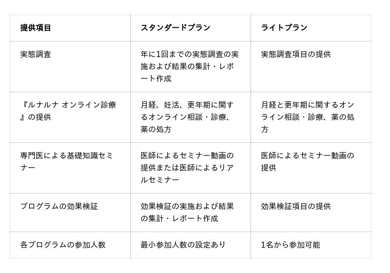 オンライン診療サービス『ルナルナ オンライン診療』を活用し、企業で働く従業員の健康課題改善から効果検証までを一気通貫でサポートする法人向けサービス。女性向けには、月経やPMSの症状から、妊娠や不妊、更年期症状に関するセミナーや産婦人科医への相談、男性向けには、男性更年期に関するセミナーや泌尿器科医への相談の機会を提供しています。