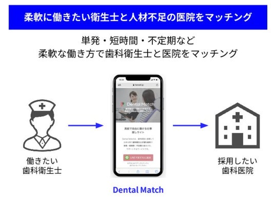本サービスにより単発・短時間・不定期など柔軟な働き方を可能にし、歯科衛生士および歯科医院双方の課題を解決します。また、転職や育児等からの復職検討時にお試し勤務として活用いただくことで医院・衛生士ともに満足度の高いマッチングにて長期雇用が期待できるなど、スポット雇用を主軸とした新しい転職の仕方・働き方も提供します。