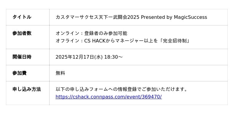 既存顧客営業に特化したカスタマーサクセスプラットフォーム「MagicSuccess(マジックサクセス)」を提供する株式会社UPDATA(本社:東京都港区、代表取締役:岡村雅信)は、2025年12月17日(水)開催『カスタマーサクセス天下一武闘会2025』に、プラチナスポンサーとして協賛することをお知らせいたします。