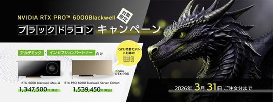 AIとビジュアライゼーションのソリューションカンパニーである株式会社ジーデップ・アドバンス(GDEP Advance,Inc. 本社:東京都中央区、代表取締役CEO:飯野匡道、東証スタンダード 証券コード:5885)は、2025年10月1日(水)よりアカデミック(学校教育法で定められた教育機関)ユーザーとNVIDIA Inception Programパートナー向けに、「RTX PRO 6000 Blackwell Max-Q Workstation Edition」および「RTX PRO 6000 Blackwell Server Edition」の2機種を対象とした「ブラックドラゴンキャンペーン」を台数限定で開催いたします。