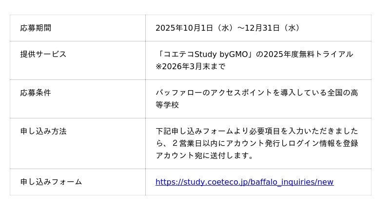 またこの度、バッファローのWi-Fiアクセスポイントをご利用中の高等学校を対象に、「コエテコStudy byGMO」を2026年3月末まで無料でお試しいただけるキャンペーンを実施いたします。本リリース内の応募フォームよりご応募ください。