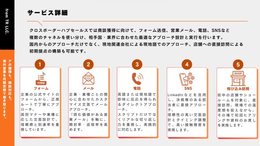 合同会社from TR(本社:東京都台東区、代表:佳山 林倭⼰・棚原 政幸、以下 from TR)は、中小製造業に向けた海外営業支援サービス「クロスボーダーハブセールス」を開始しました。月10万円から利用でき、見込み客の発見、面談設定、商談同席、見積・条件調整、サンプルや初回の少量出荷までをまとめて支援します。自社に専任の海外営業部がなくても、海外での売上づくりを前へ進められる体制を提供します。