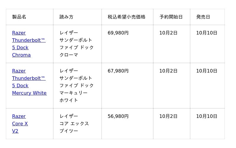 【Razer】次世代接続性能を誇る「Razer Thunderbolt(TM) 5 Dock Chroma」と「Razer Core X V2」を発表2025年10月10日(金)発売