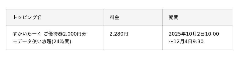 KDDI、沖縄セルラーは2025年10月2日から、povo2.0の「今だけのトッピング」として、「ガスト」、「バーミヤン」、「しゃぶ葉」など全国のすかいらーくグループ店舗で利用可能な「すかいらーく ご優待券2,000円分」と「データ使い放題(24時間)」(注)がセットになったトッピングを2,280円で提供します。データ購入とあわせて、すかいらーくグループでのお食事をおトクにご利用いただけます。