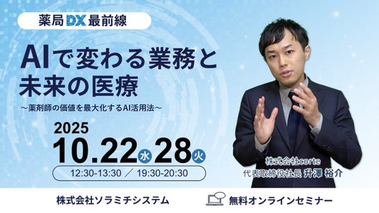 クラウド電子薬歴『CARADA 電子薬歴 Solamichi』の企画・開発・販売を行う株式会社ソラミチシステムは、無料オンラインセミナー「薬局DX最前線:AIで変わる業務と未来の医療」を10月22日(水)、28日(火)に開催します。