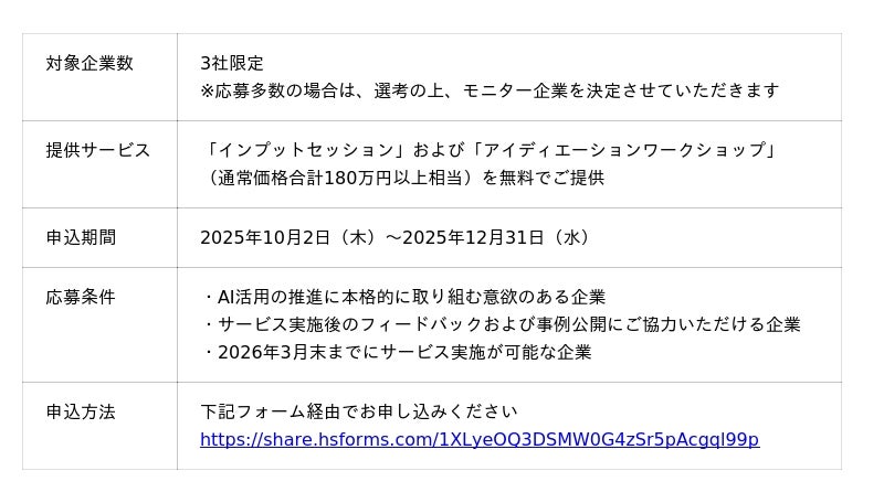 ~AIの基礎知識習得からPoC開発まで、企業のAI導入を一貫サポート。サービス提供開始を記念し【3社限定】無料モニターキャンペーンも実施~