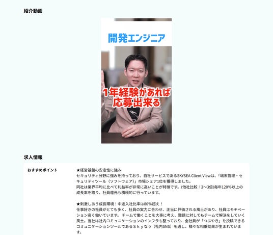 一部の求人ページでは、企業の生の情報やITエンジニア業界、最新市場に詳しいIT菩薩モロー(毛呂 淳一朗)による求人紹介動画を閲覧できます。動画では、「企業が求めているリアルな人材像」や「入社後に目指せる年収・キャリアパス」など従来のポータルサイトなどのテキストベースのメディアからは取得しづらく、求人情報には掲載されていない独自情報も提供しています。