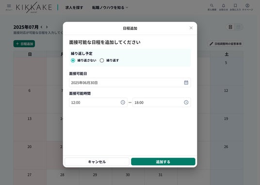 ポータルサイトで会員登録を行うと選考管理/面接日程調整ができます。自己応募の場合、応募する求人が10社あるとその分個別に選考の連絡や日程調整を行う必要があります。一方、本ポータルサイトでは、面接対応が可能な日程を設定しておけば、キャリアアドバイザーが企業との日程調整を行ってくれるため手間や負担が大幅に軽減できます。