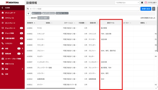 八千代ソリューションズ株式会社(本店:東京都台東区、代表取締役社長:水野高志)が提供するクラウド設備管理システム「MENTENA(メンテナ)」は、2025年10月6日より、設備や部品情報に管理用のラベル(タグ)を設定する「属性ラベル」機能を新たに提供します。より柔軟に設備や部品を管理・検索できることで、点検漏れの防止や部品交換のリードタイム削減につながり、保全活動の質を向上します。