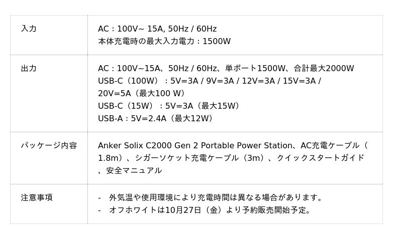 米国・日本・欧州を中心にデジタル関連製品でトップクラスの販売実績を誇るAnkerグループの日本法人、アンカー・ジャパン株式会社(本社:東京都千代田区、代表取締役CEO:猿渡 歩)は、5年連続世界No.1モバイル充電ブランド (※) の「Anker」が展開するポータブル電源シリーズAnker Solixにおいて、ポータブル電源「Anker Solix C2000 Gen 2 Portable Power Station」および、ソーラーパネル「Anker Solix PS100 Dual Portable Solar Panel」を2025年10月2日(木)よりAnker Japan 公式オンラインストア(製品ページ:https://www.ankerjapan.com/pages/solix-c2000-gen2)、直営店 Anker Store、総合オンラインストアAmazon.co.jp(製品ページ:https://www.amazon.co.jp/dp/B0FRFSFCQH)、楽天市場(製品ページ:https://item.rakuten.co.jp/anker/a1783/)および一部家電量販店にて予約販売を開始いたします。