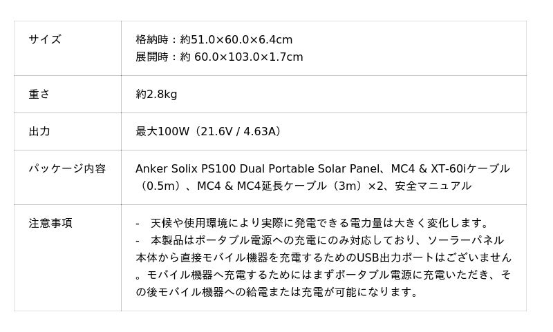 - パワフルな高出力:1枚あたり最大100W出力でAnkerのポータブル電源を充電可能(※ 天候や使用環境により実際に発電できる電力量は大きく変化します)。