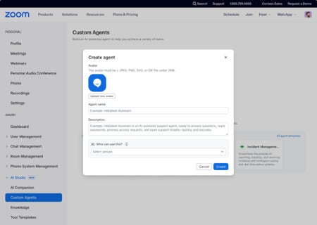 - Zoom AI Studio の Custom AI エージェントにより、IT 管理者はナレッジベースやツールを設定し、AI エージェントの機能を導入前にテストできるようになります。(2025 年 9 月提供予定)このエージェント ビルダーは、モデル コンテキスト プロトコル(MCP)対応により、簡単に利用できるツールの設定・構築機能も備えています。