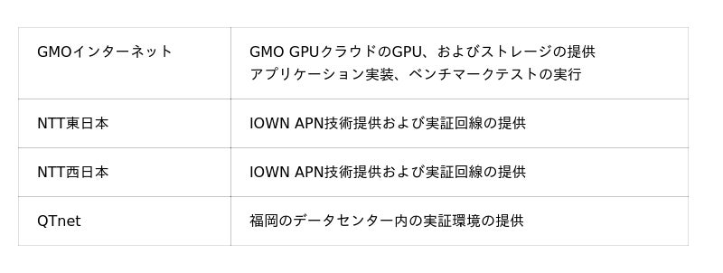 GMOインターネットグループのGMOインターネット株式会社(本社:東京都渋谷区、代表取締役 社長執行役員:伊藤 正、以下、GMOインターネット)、NTT東日本株式会社(本社:東京都新宿区、代表取締役社長:澁谷直樹、以下、NTT東日本)、NTT西日本株式会社(本社:大阪府都島区、代表取締役社長:北村亮太、以下、NTT西日本)、株式会社QTnet(本社:福岡県福岡市、代表取締役社長:小倉 良夫、以下、QTnet)は、共同実験協定を締結し、2025年10月2日(木)よりAI開発基盤となるGPUとストレージ間の遠隔利用に関する技術実証(以下、本実証)を開始します。なお、「GMO GPUクラウド」のGPU(AIの演算装置)と大容量ストレージ間を「IOWN(Innovative Optical and Wireless Network) APN(All-Photonics Network)」を活用し、県間接続をする初めての取り組みとなります。