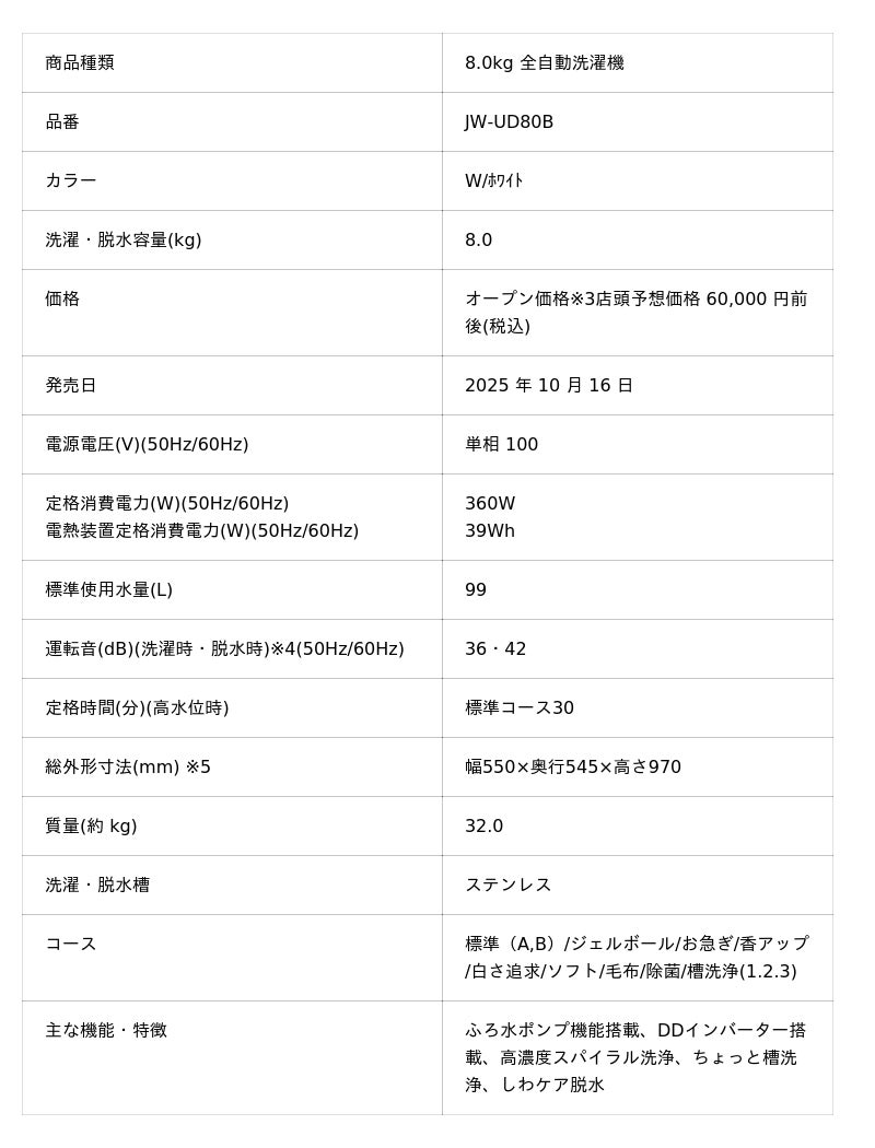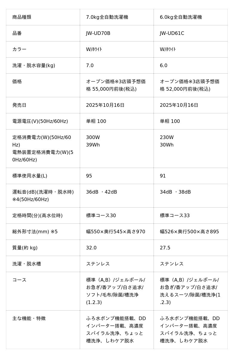 8.0kg 全自動洗濯機(JW-UD80B)・7.0kg 全自動洗濯機(JW-UD70B)・6.0kg 全自動洗濯機(JW-UD61C ・JW-U61C)・5.0kg 全自動洗濯機(JW-U50C)の概要は以下の通りです。