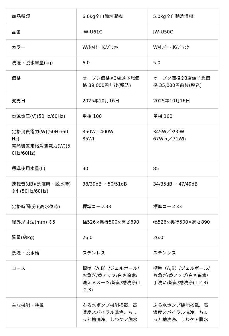 この度、新たに DD インバーターモーター搭載の 6.0 kgモデル(JW-UD61C)と、通常タイプの 5.0 kgモデル(JWU50C)を追加しました。