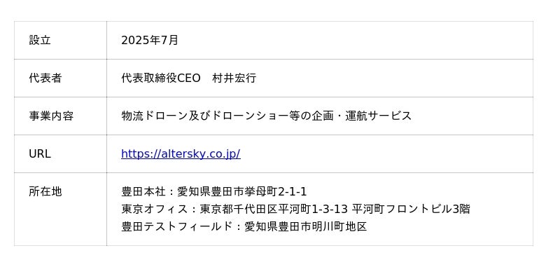 物流ドローン及びドローンショーの企画・運航サービスを提供する株式会社AlterSky(本社:愛知県豊田市、代表取締役CEO 村井宏行、以下「AlterSky」)は、2025年7月に株式会社SkyDrive(本社:愛知県豊田市、代表取締役CEO 福澤知浩、以下「SkyDrive」)のドローン事業部から分社化し設立されたことをお知らせいたします。また、星野リゾート トマム(北海道勇払郡占冠村、総支配人 渡辺巌)(※1)にて、日本初(※2)となるリゾート施設での長期常設型のドローンショーを2025年12月6日(土)から開始することをお知らせいたします。