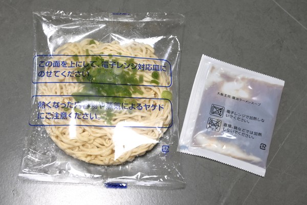 調理は、麺を電子レンジで3分20秒(500w)加熱。添付のスープを溶くためにお湯を用意する必要があります。