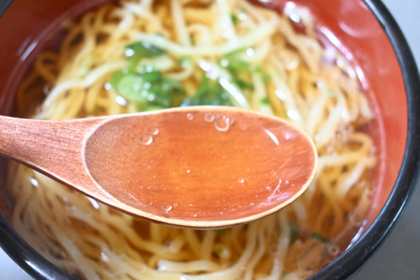 いざひと口。スープはすっきりとした醤油味で、スルリと喉に入ってきます。かつお出汁がきいており、コクと滋味深さがあります。さらに、ネギ油が香りづけに使われているようで、香ばしい香りが食欲を掻き立てます。