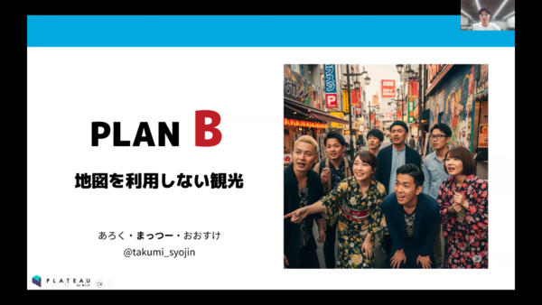 松村氏は、PLATEAUの属性情報を使った「地図を利用しない観光」というアイデアを紹介した。2025年3月に行われた「PLATEAU × 関西未来創造アイデアソン」にて、チーム(あろく・まっつー・おおすけ)で考えたものだ。