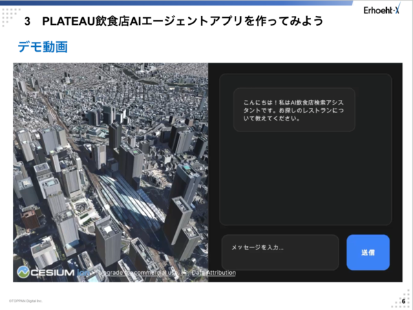 発表したのは、PLATEAUの3D都市モデルとAIエージェントを組み合わせた「飲食店AIエージェント」。チャット形式で「新宿の居酒屋」などと依頼すると、AIが人数や予算といった条件を対話的にヒアリングし、ユーザーの回答をもとに条件に合う店舗を検索して、PLATEAUの3D都市空間上にその位置をマーカーで表示する。候補を選択すれば店舗情報も確認できるというもの。