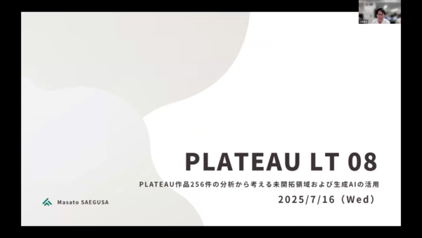 PLATEAUの3D都市モデルを活用するユーザーがさまざまなテーマで発表するライトニングトーク(短時間に集約して簡潔にプレゼンする形式)イベント「PLATEAU LT 08」が、2025年7月16日にオンライン形式で開催された。地図を利用しない観光やAIを活用した飲食店エージェント、交通安全シミュレーターといった実用的な提案から、Houdiniを用いたメタバースジェネレーター、プロジェクションマッピングのシミュレーターといった技術的・創造的な挑戦まで、今回も多様なLTが集まった。