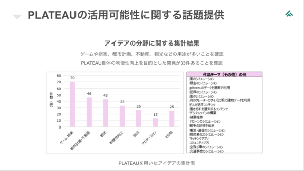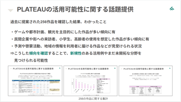 ひとつは、過去のハッカソンなどで提案された256件のPLATEAU作品を分析し、傾向を把握することだ。実際に、2024年までにアイデアソン・ハッカソンで生まれた256作品を、「属性データを使用しているか」「どういった分野か」「利用者と提供価値は何か」といった項目で分析した。この分析から、三枝氏は「ゲーム・娯楽」「都市計画・不動産」「観光」分野に作品が集中している一方、「都市に出没する野生動物」といったテーマは未開拓の領域であることを見いだしたという。